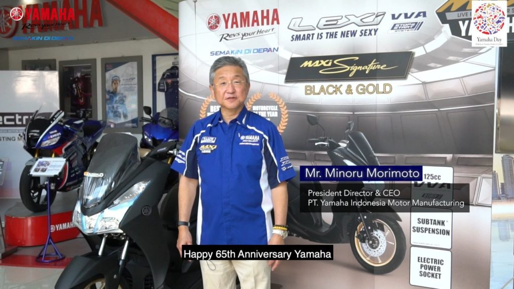 Sedangkan di Indonesia, President Director & CEO PT Yamaha Indonesia Motor Manufacturing (YIMM) juga memberikan pesan khusus. ”Tanggal 1 Juli 2020 merupakan hari jadi Yamaha Motor Company yang ke-65, dan tanggal 6 Juli 2020 merupakan hari jadi YIMM yang ke-46. Ulang tahun Yamaha kali ini menjadi spesial, karena kita merayakannya dalam kondisi yang berbeda. Pandemi virus corona telah berdampak kepada kita semua. Namun saya percaya bahwa di dalam setiap musibah, selalu terdapat hikmah yang bisa kita petik. Saya percaya bahwa kondisi ini tidak akan mengalahkan kita, namun justru membuat kita semakin kuat. Saya berharap, kita dapat belajar mengenai nilai-nilai khas dari brand Yamaha, yang kemudian dapat kita gunakan sebagai inspirasi untuk diterapkan ke dalam kehidupan sehari-hari.”