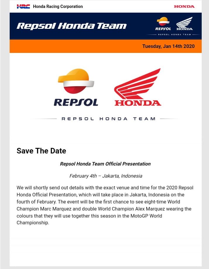 Lalu selain merilis tim Repsol Honda 2020 ada hidden agenda apa nih??? Rilis motor baru kah??? secara tanggal 16 januari ini isunya ada rilis motor baru juga.